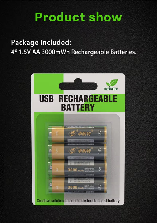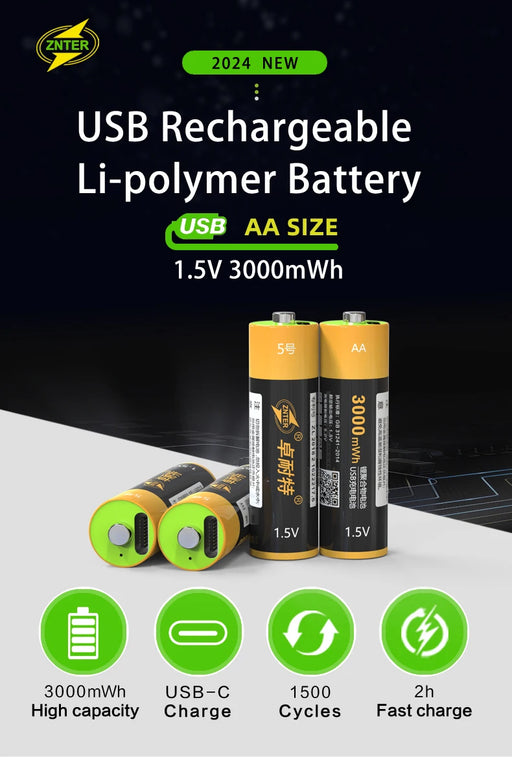 Znter AA rechargeable 3000 mWh 4 pack 2000mah li-polymer li-po TYPE C usb